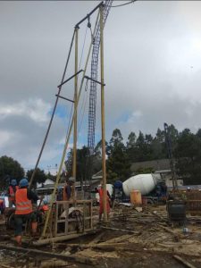 Pelak sanaan pondasi bor pile di mulai dari pembuatan lobang di tanah dengan cara tanah di bor terlebih dahulu kemudian penginstalasan besi tulang ke dalam lobang Yang di lanjutkan pengecoran.